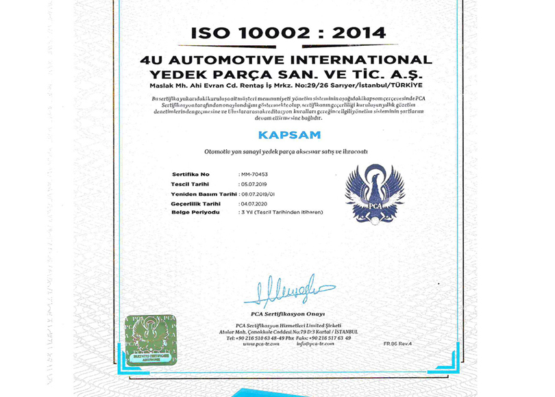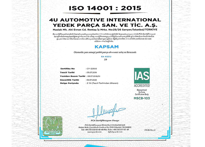 4u Autoparts, Kalite Yatırımlarındaki tüm süreçlerinde "Sürdürülebilir Gelişim" odağı ile hareket etmektedir. Bu yaklaşımla iş süreçlerimizi ve hedeflerimizi sürdürülebilir Kalite ilkeleriyle bütünleştirip, Toplam kalite yönetimi prensibini uygulamaktadır.